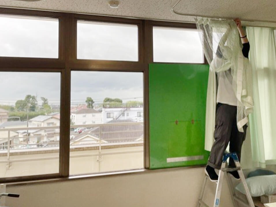 施設にて設置済みカーテンを外し予備カーテンと入れ替えます。