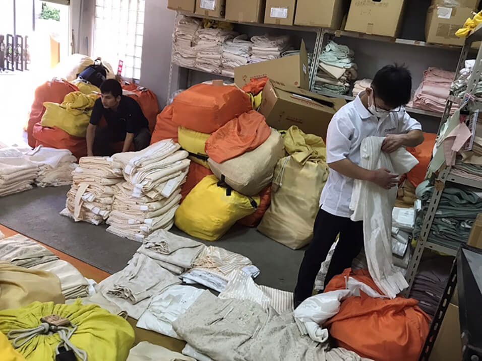 倉庫内にて翌日に行く施設の予備カーテンの準備をします。